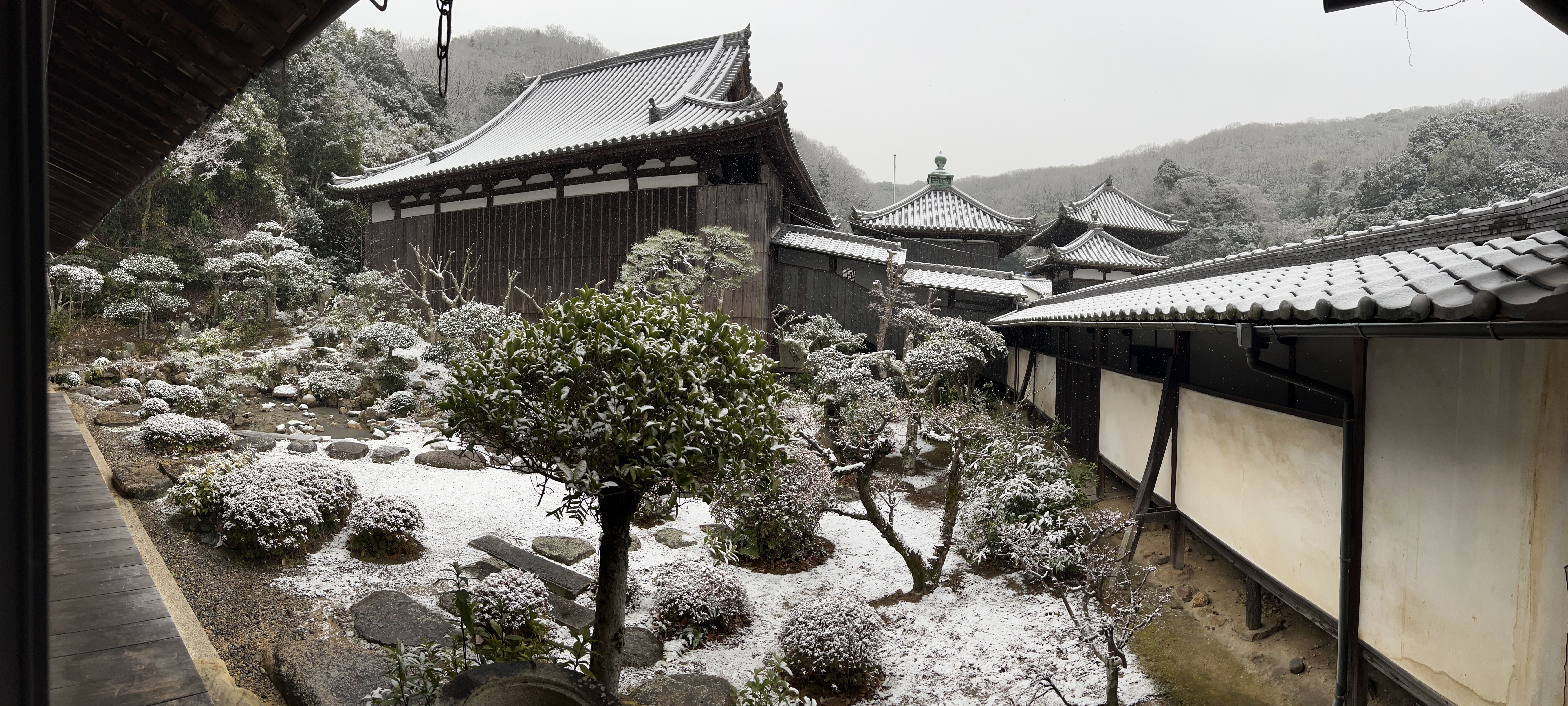 最近、害獣(イノシシ)の被害でこちらの中庭も荒らされ、美しかった苔の多くが剥がされ非常に残念ですが、こうして雪の降り積もる様子は大変美しく、音のないまるで絵画の中の世界に迷い込んだような不思議な気持ちになります。